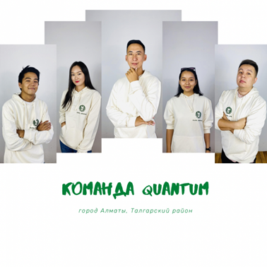 - Балалар мен жасөспірімдердің эко-санасын қалыптастыруға арналған білім беру бағдарламалары жобасымен Quantum (Байжұма Жандос, Тарғын Айнұр, Мұхаметқали Айару, Алишер Бигали, Мырзатаев Эльдар).